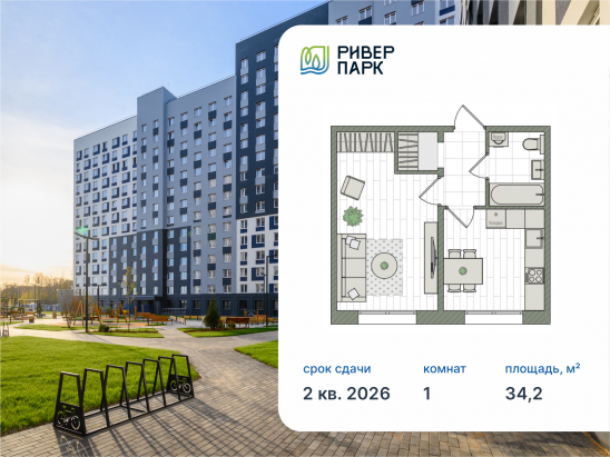 1-комнатная, 34.2 м², №613 , Квартира с отделкой
