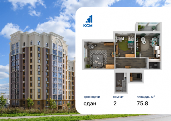 3-комнатная, 75.8 м², №249 , Квартира с отделкой