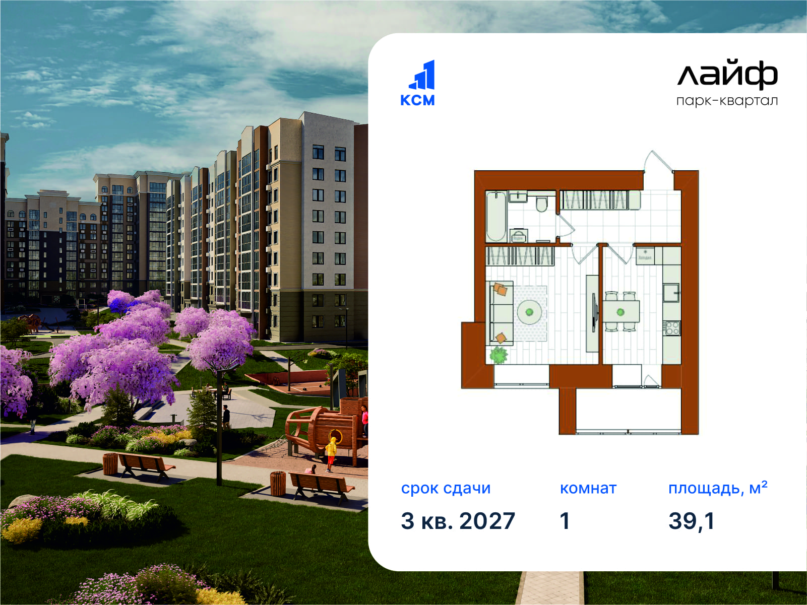 1-комнатная, 39.1 м²