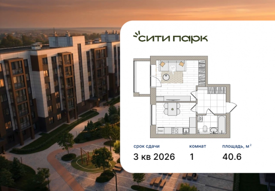 1-комнатная, 40.6 м²