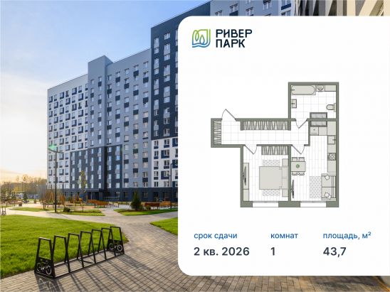 1-комнатная, 43.7 м²