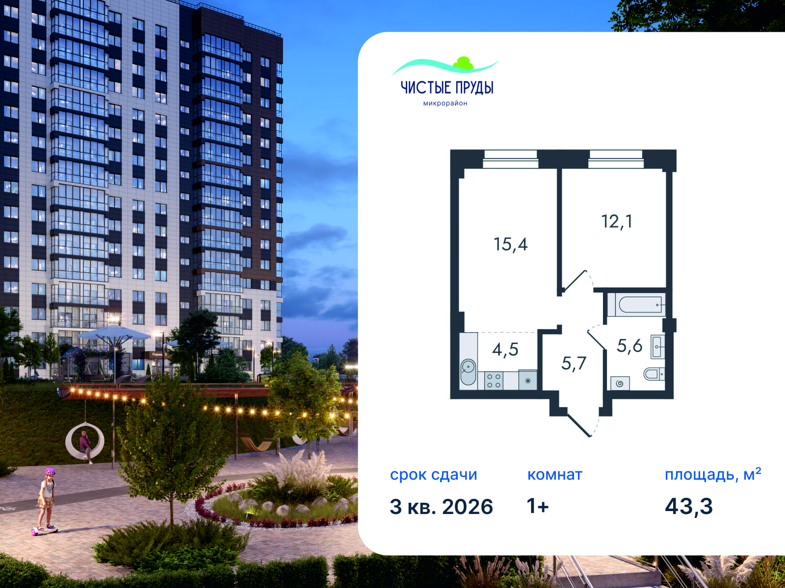 - № 426 Проект Чистые пруды Отделка Без отделки Этаж 16 Скидка до -30% на чистовую отделку Семейная ипотека от 3,5% Базовая ипотека от 15,7%