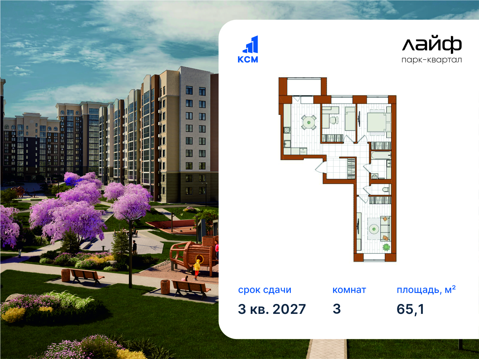 3-комнатная, 65.1 м²
