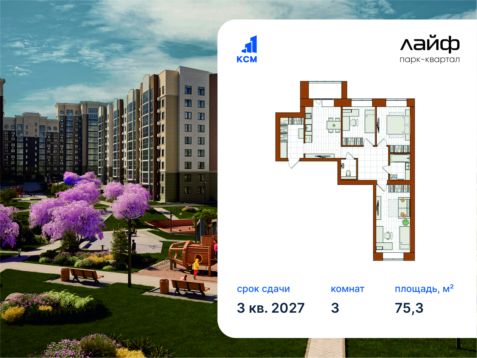 3-комнатная, 75.3 м²