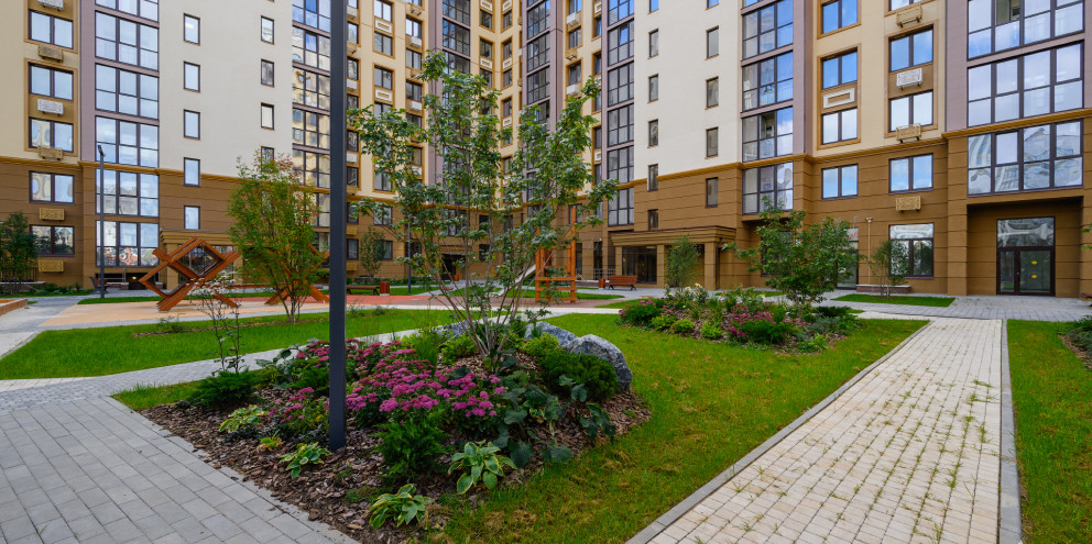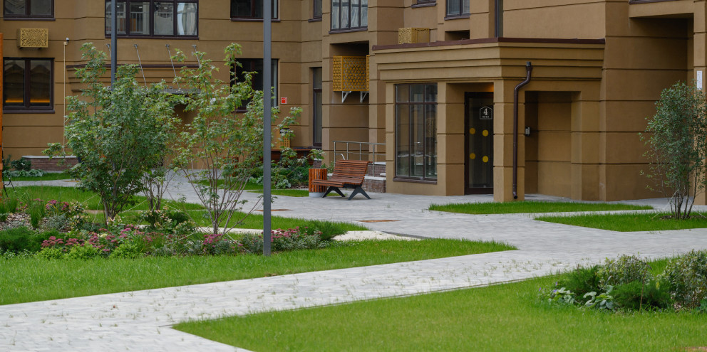 Ваш островок тишины и уютаДвор-парк — это настоящий зелёный оазис. Ландшафтный дизайн с многоуровневыми посадками, кустарниками и цветниками создаёт атмосферу уюта и гармонии. Летом здесь тень от деревьев и яркие краски цветов, осенью — золотой ковёр листвы, а зимой — аккуратные аллеи и украшенные ели. Вечером двор преображается благодаря продуманной системе трёхуровневого освещения: основное гарантирует безопасность, акцентное выделяет дорожки и игровые зоны, а декоративное подчёркивает красоту озеленения.